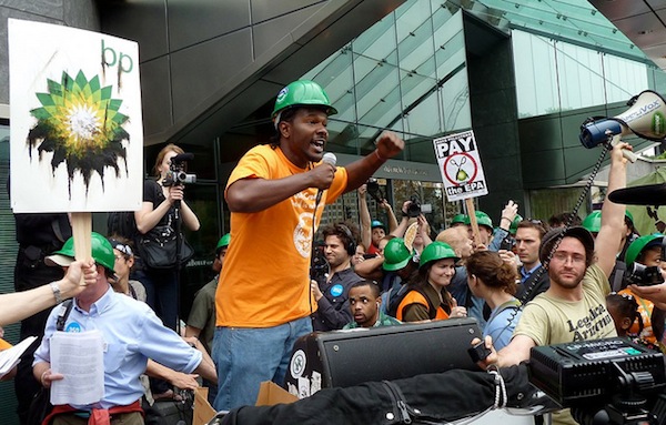 Andre Gaines of Lucedale, Mississippi, a former BP oil disaster clean-up worker who has fallen ill, rallies thousands of youth outside of BP's lobbying headquarters.