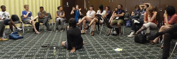 Next, the audience – made up of artists, community organizers, teachers, librarians, journalists, filmmakers, dancers, and more – answered that same question in small groups. Then the whole group came together for a wide-ranging discussion. From facing the loss of a creole language in central Canada; to fighting unjust deportations through music in Philadelphia; to protesting school closings in Chicago, and beyond, the discussion touched on self-determination, language, displacement, power, reframing disaster, and connections across places and struggles.